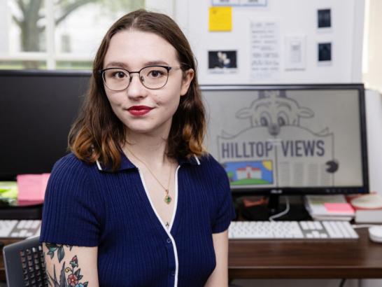 The Hilltop Views editor-in-chief sits at a desktop computer in the Hilltop Views newsroom.