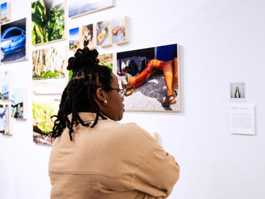 A student reads a biography of a student artist and views their work in the Fine Arts Gallery.