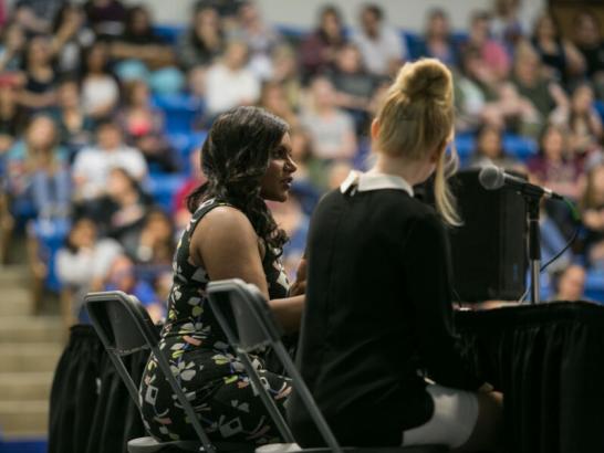 Mindy Kaling sits and speaks to an audience as part of the Marcia Kinsey Visiting Writers Series.