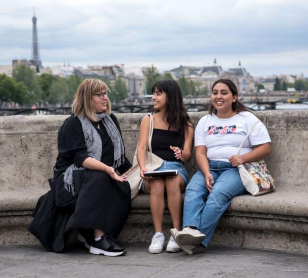 Students sitting near the Seine in Paris, France during their study abroad trip.