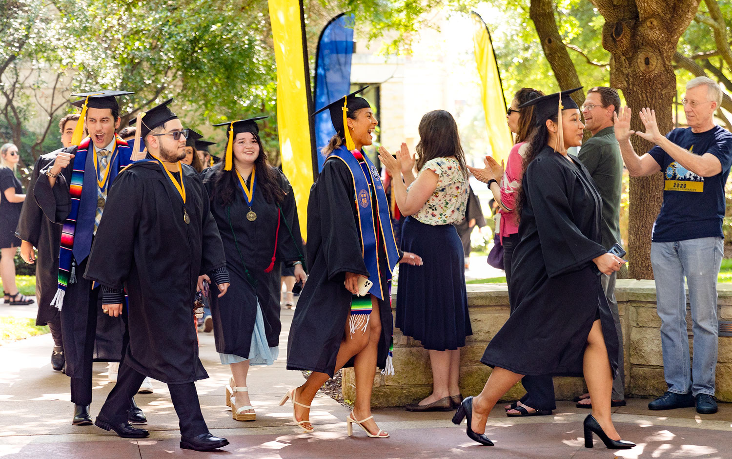 This beloved campus tradition symbolizes the completion of their academic careers and entry in the St. Edward's alumni community. Faculty, staff, alumni, classmates, family, and friends cheer on our graduates and share a champagne toast to their achievements.