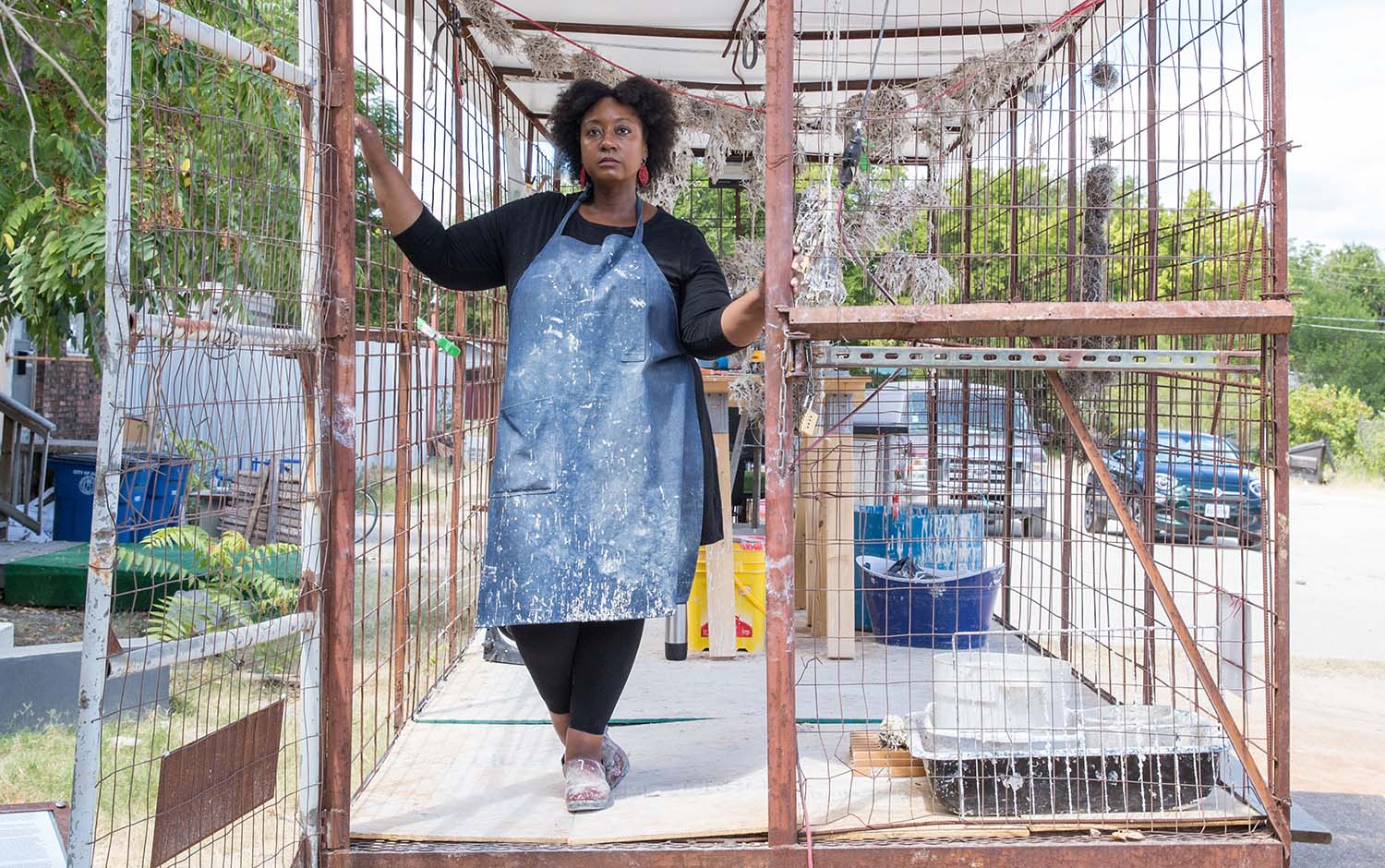 Within the confines of her caged studio, Tammie Rubin dips ball moss into porcelain slip. The transformed plants are eventually attached to the ceramic conical forms that define much of Rubin’s work. The pieces will create part of her solo exhibition “Everything You Ever,” on display at Women and Their Work in Austin, Nov. 17 through Jan. 10, 2019.