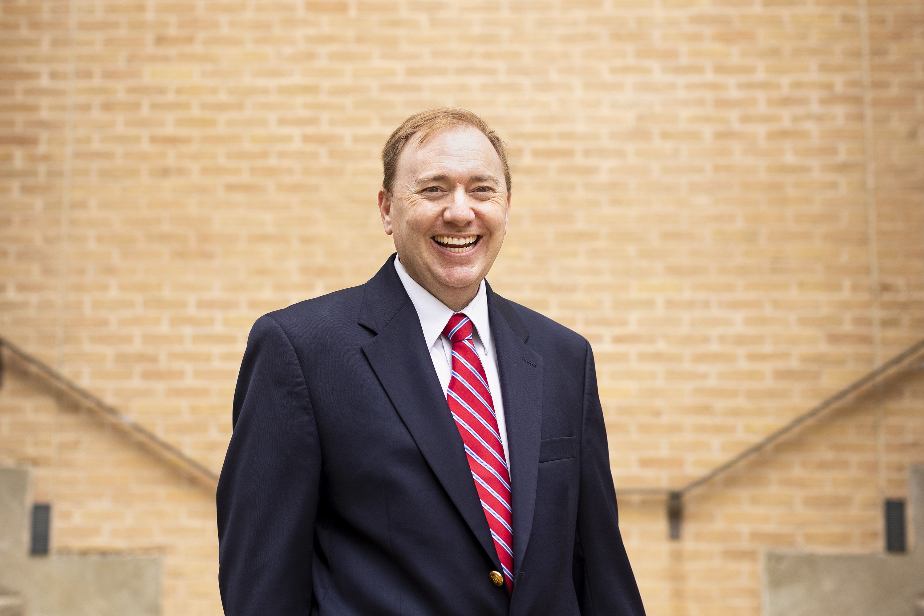 A man in a suit smiles in front of a brick wall