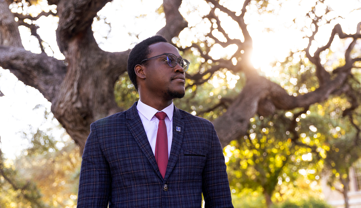 Emmanuel Epau ’24 stands in front of the Bill Munday School of Business