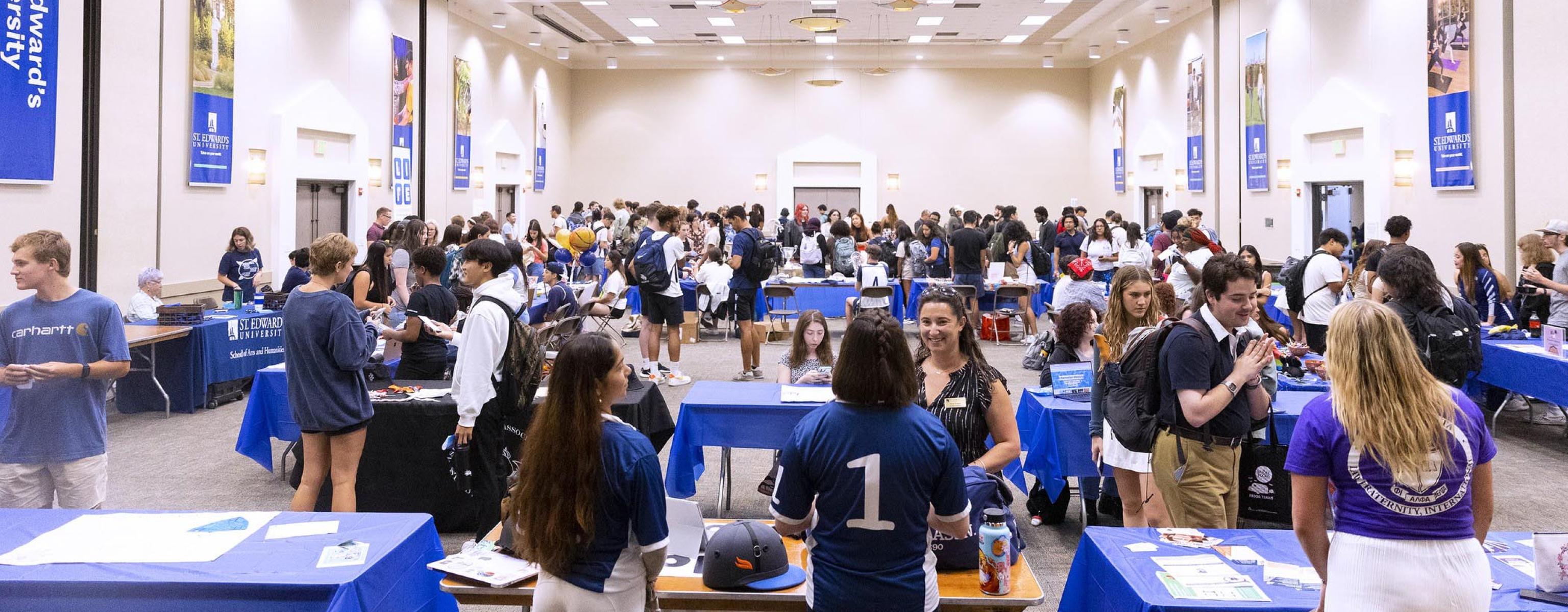 Students explore clubs and organizations at various tables in front of Main Building on the St. Edward's University campus