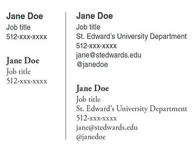 Because St. Edward’s University is one brand, there is one correct format for the official letterhead, email signatures, envelope and business cards to be used across all core academic identities, brand extensions and official university business. When used consistently, our brand is undiluted and presents professionalism.