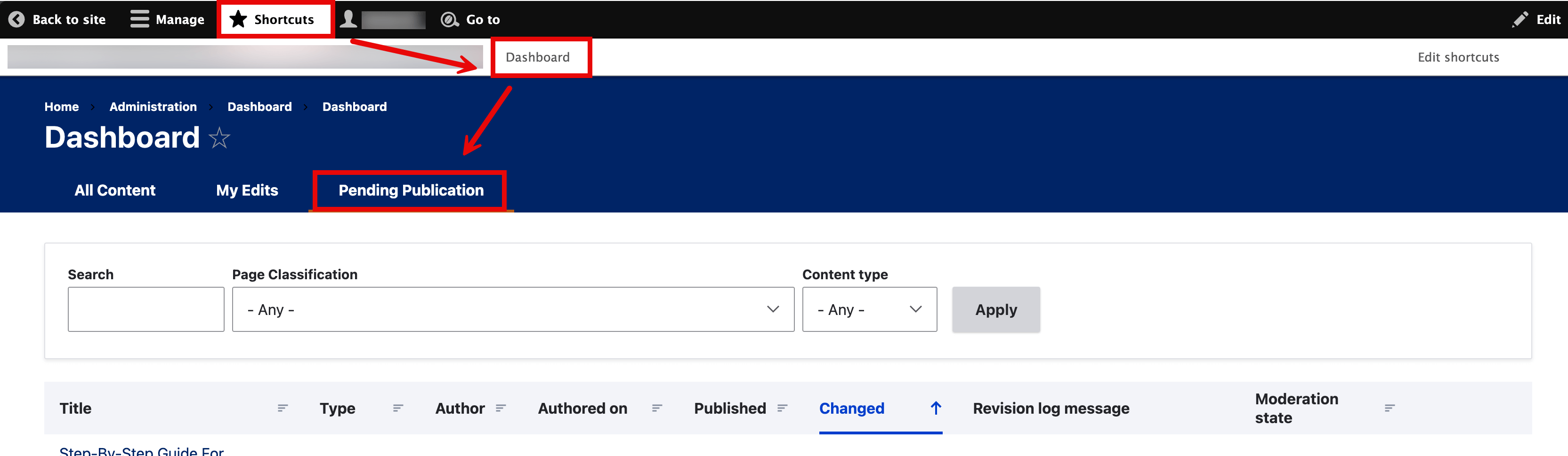 Drafts marked as "Send to Review" can be found in the CMS Dashboard. Go to the CMS toolbar and select Shortcuts → Dashboard → Pending Publication.
