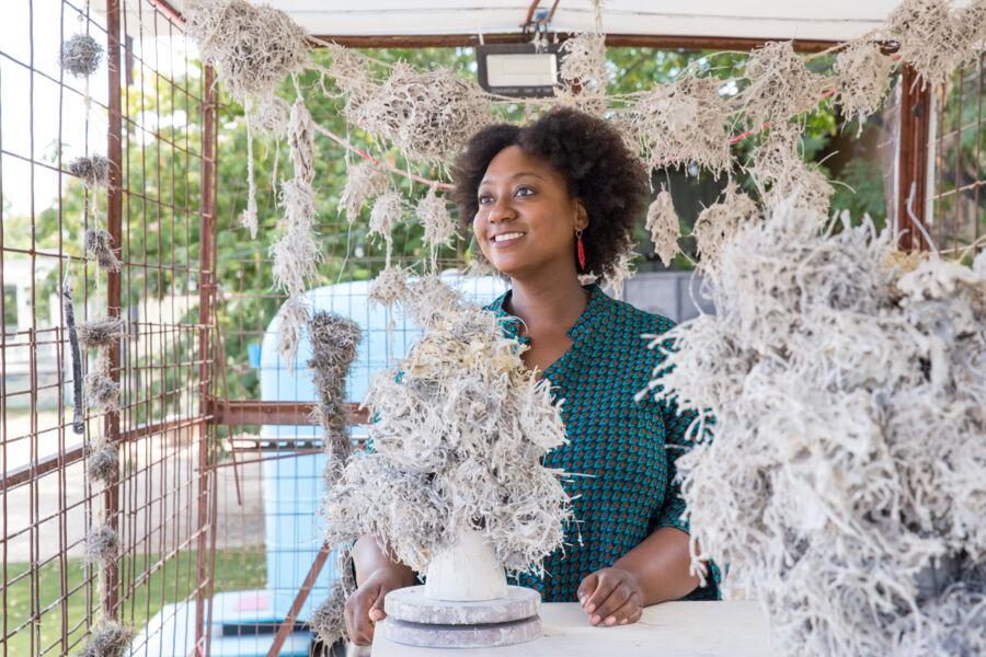 Within the confines of her caged studio, Tammie Rubin dips ball moss into porcelain slip. The transformed plants are eventually attached to the ceramic conical forms that define much of Rubin’s work. The pieces will create part of her solo exhibition “Everything You Ever,” on display at Women and Their Work in Austin, Nov. 17 through Jan. 10, 2019.