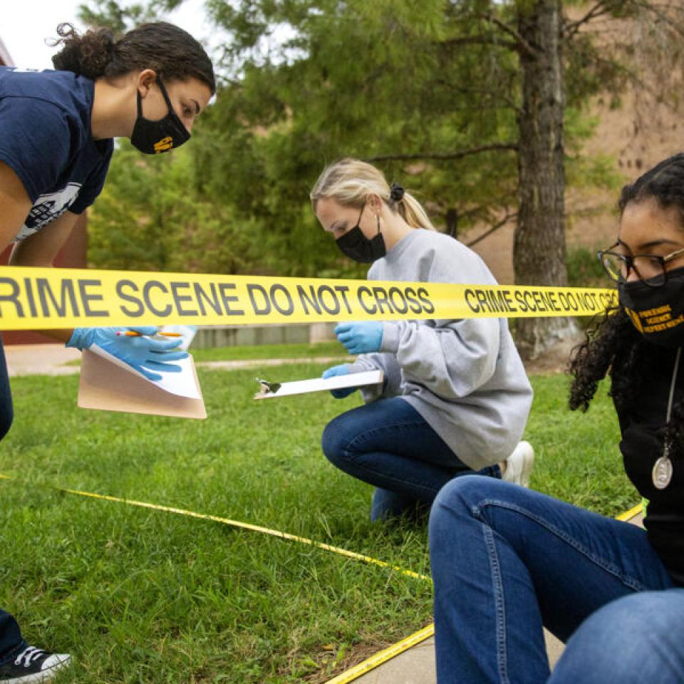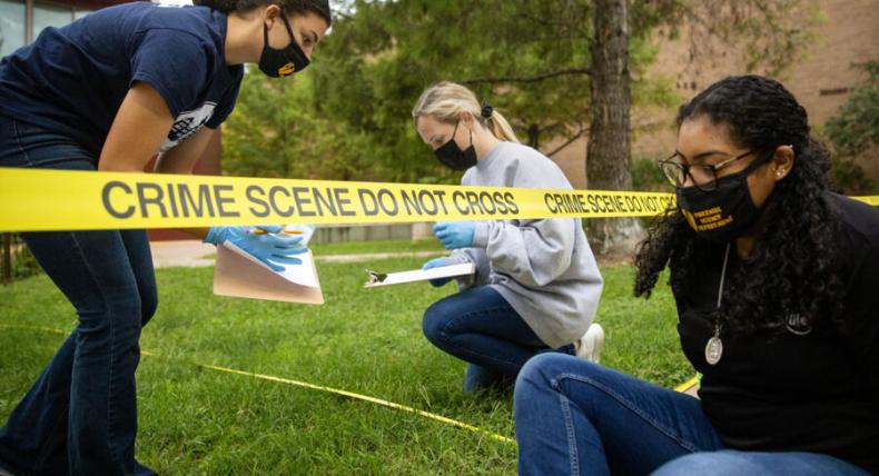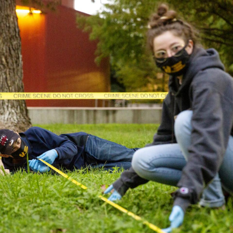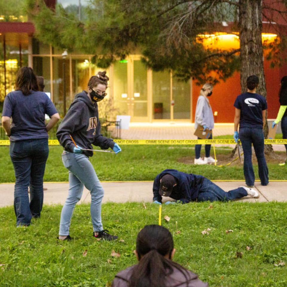 Students participating in a class and learning how to inspect a crime scene on campus