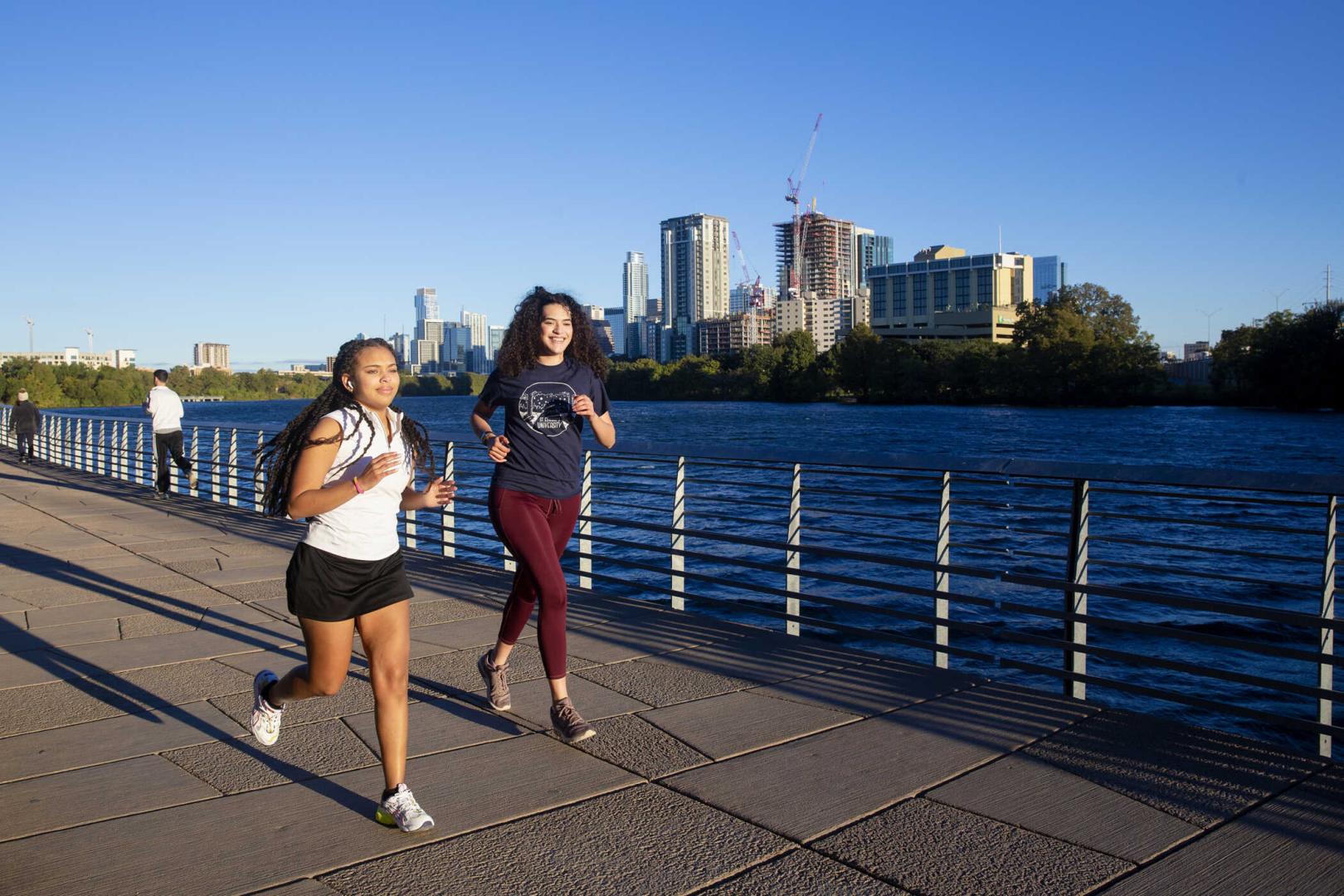 Several mornings a week, Taylor Huey ’21 starts her day with a 2-mile run around Lady Bird Lake. It’s a practice she began last spring, when she was back home in Dallas and went for jogs around her neighborhood just to get out of the house. On Zoom calls, she and her friends discovered they were all doing the same thing, so they decided to keep up their habit together when they returned to Austin. The run clears her mind for the day ahead.
