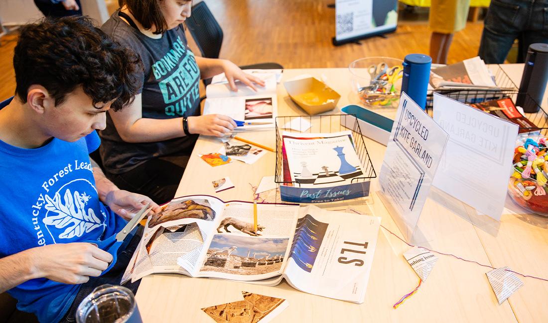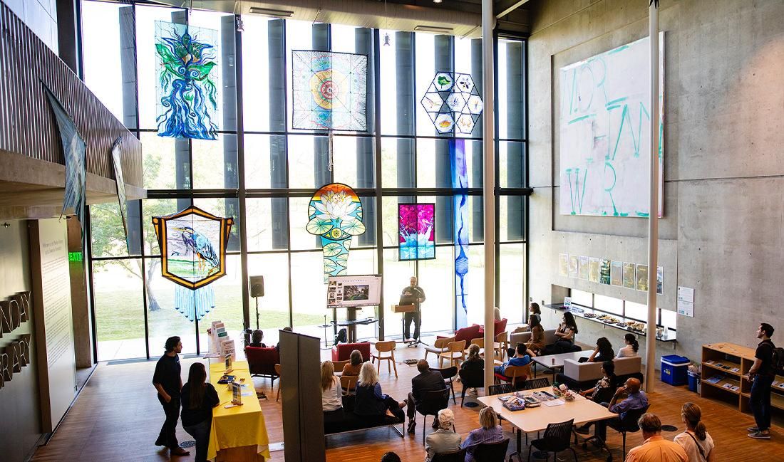 More than 45 kites are on display throughout the library, with each one ranging in size (up to two stories tall) and representing Central Texas springs. Martin invited some of the artists behind the kite crafts to speak to students about the significance of water conservation and how it resonates with their work. In the weeks leading up to Earth Day, students participated in multiple workshops where they had the opportunity to create their own kites made with sustainable materials.