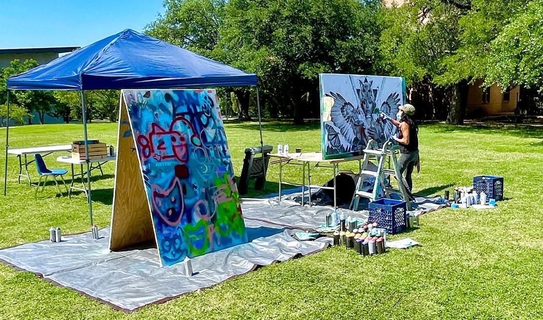 On Earth Day, renowned Austin-based street muralist Niz — noted for her large-scale stencil murals across Austin and around the world — visited Andre Lawn at St. Edward’s for an interactive muraling event with Ecopsychology students.