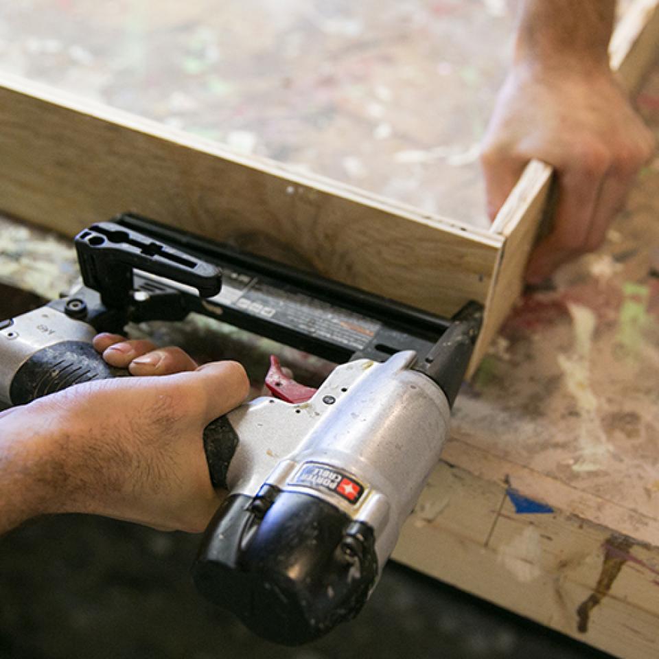 The actual construction of set pieces, costumes and props falls to other team members like Jacob Foster ’18. On previous productions, Foster worked in the costume shop and as a dresser (helping actors with costume changes), but he found his theatrical calling as a scenic artist. And there’s more to it than just the fun of welding and using an array of tools.