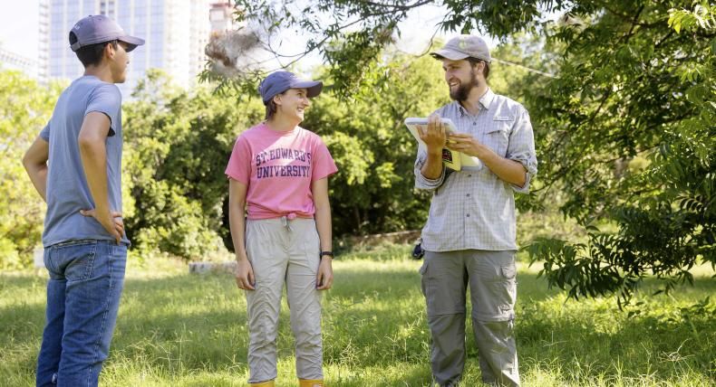 Mathematics major Stella Cunningham ’21 interned with The Nature Conservancy’s urban ecology project focused on Waller Creek in downtown Austin. She and her teammates collected data about air quality, vegetation and wildlife along the creek, which is the focus of a massive, multi-year restoration and parks development effort.