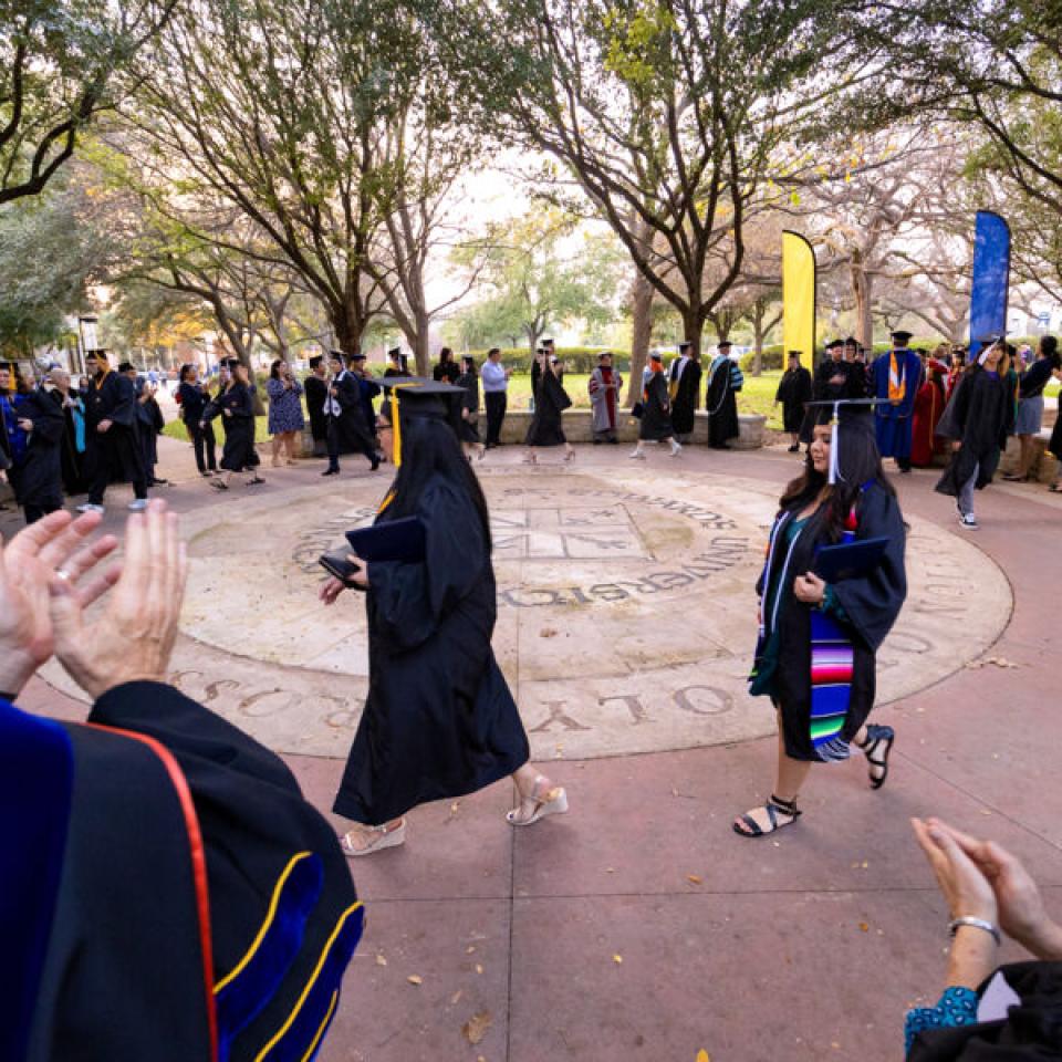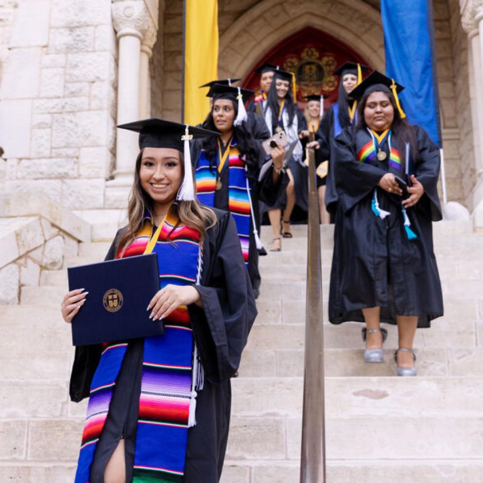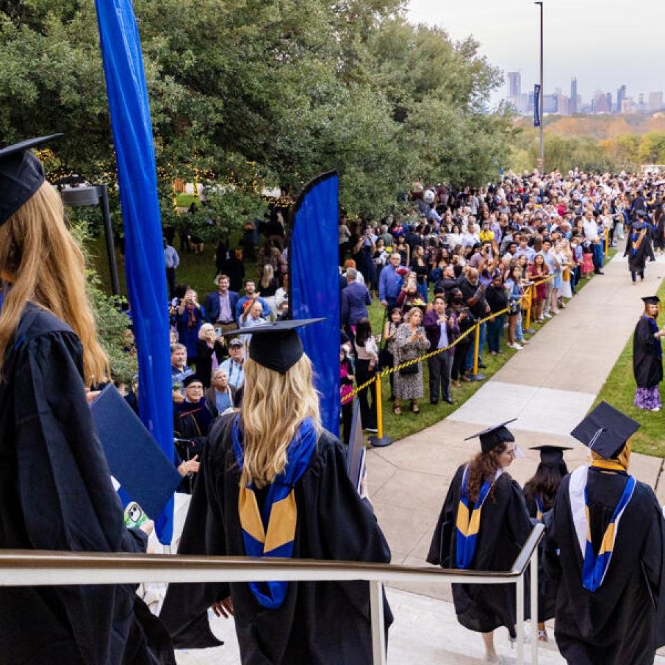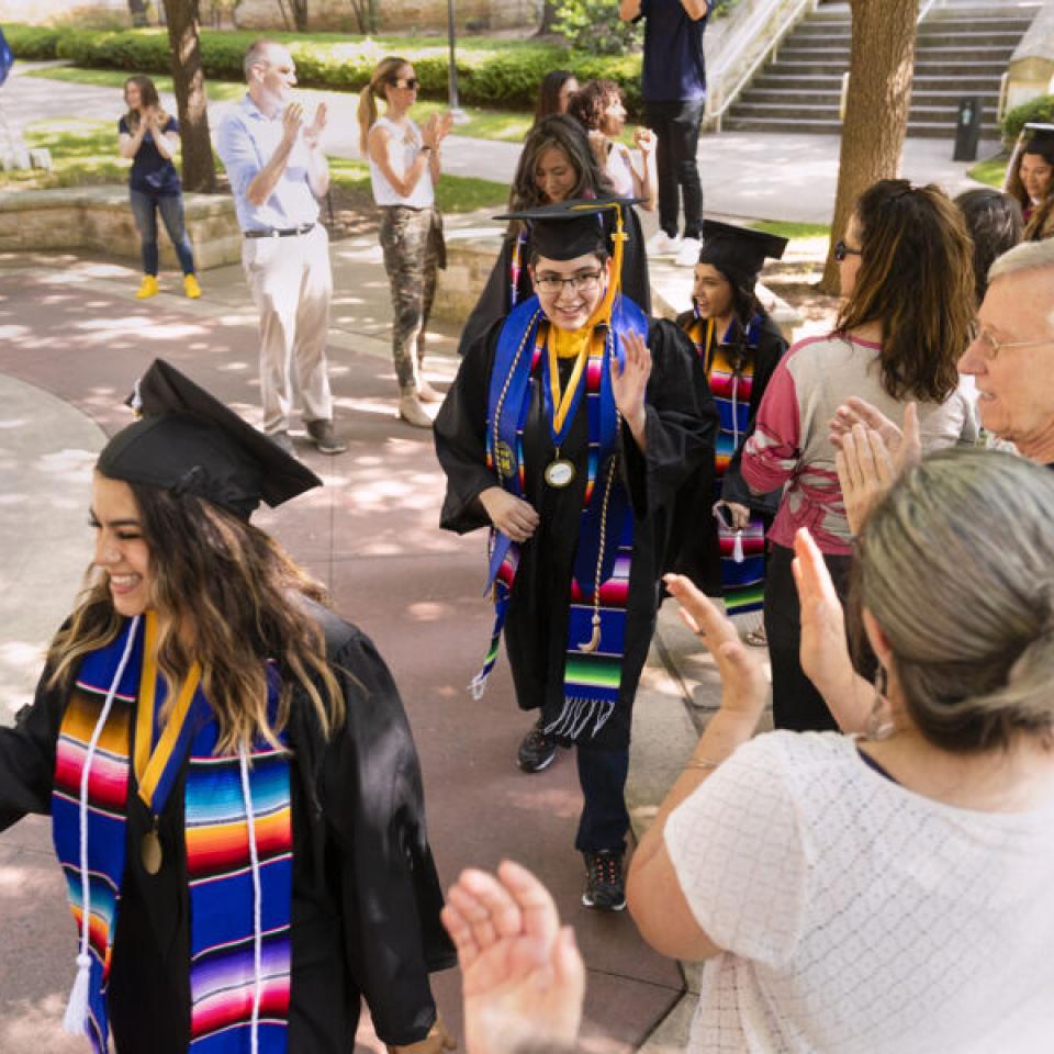 This beloved campus tradition symbolizes the completion of their academic careers and entry in the St. Edward's alumni community. Faculty, staff, alumni, classmates, family, and friends cheer on our graduates and share a champagne toast to their achievements.