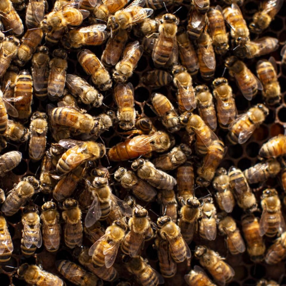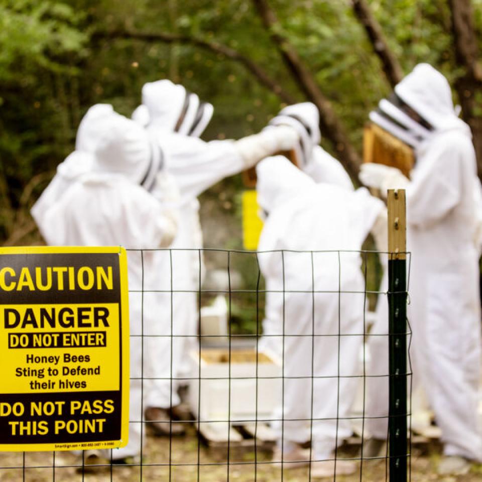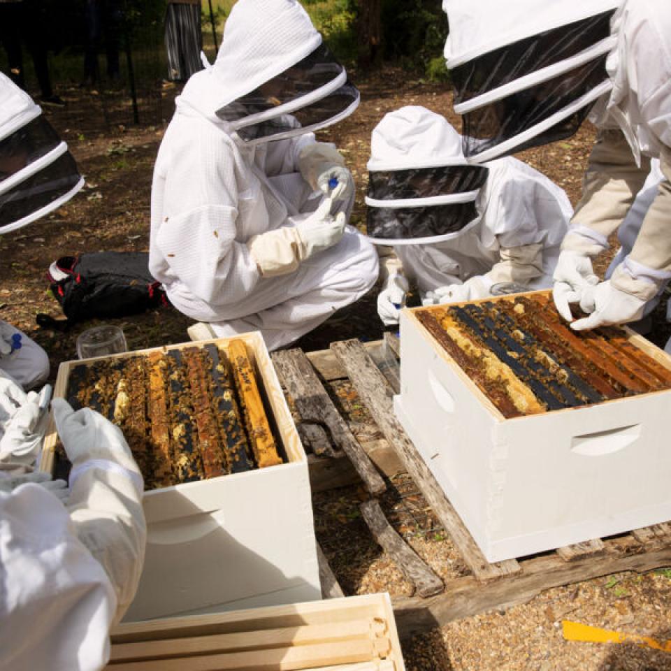 As Ranchod and Weier work, the air around them gradually fills with a low humming as the bees, alerted to an intruder, emerge from the hives to investigate. The students breathe calmly — carbon dioxide attracts the insects — and work until they’ve collected 50 bees from each hive.