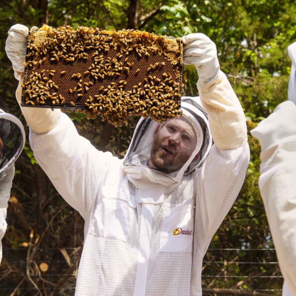 Priyanka Ranchod and David Weier hold a tray of honeycomb and bees while wearing beekeeper suits.