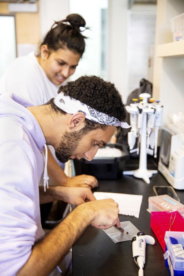 Kia Baeza, Professor Matthew Steffenson and Priyanka Ranchod conduct research on a bee sample.
