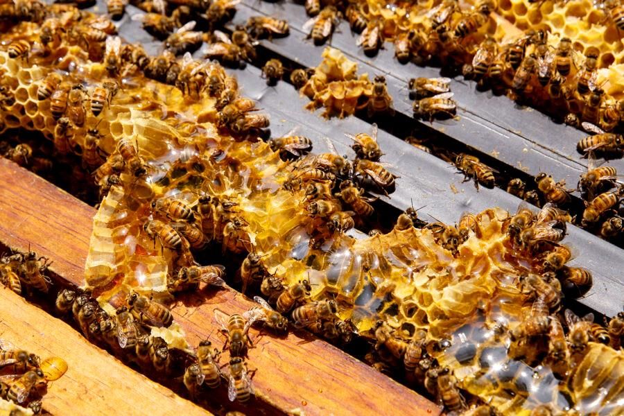 Ranchod carefully removes one of the wooden frames from the upper box. Golden comb spreads across the bottom, hexagon by perfect hexagon. “This is all new since last week,” she murmurs as she inspects it. As the colony grows, it will spread from the lower box, where the queen and most of the bees are now, into the upper box.