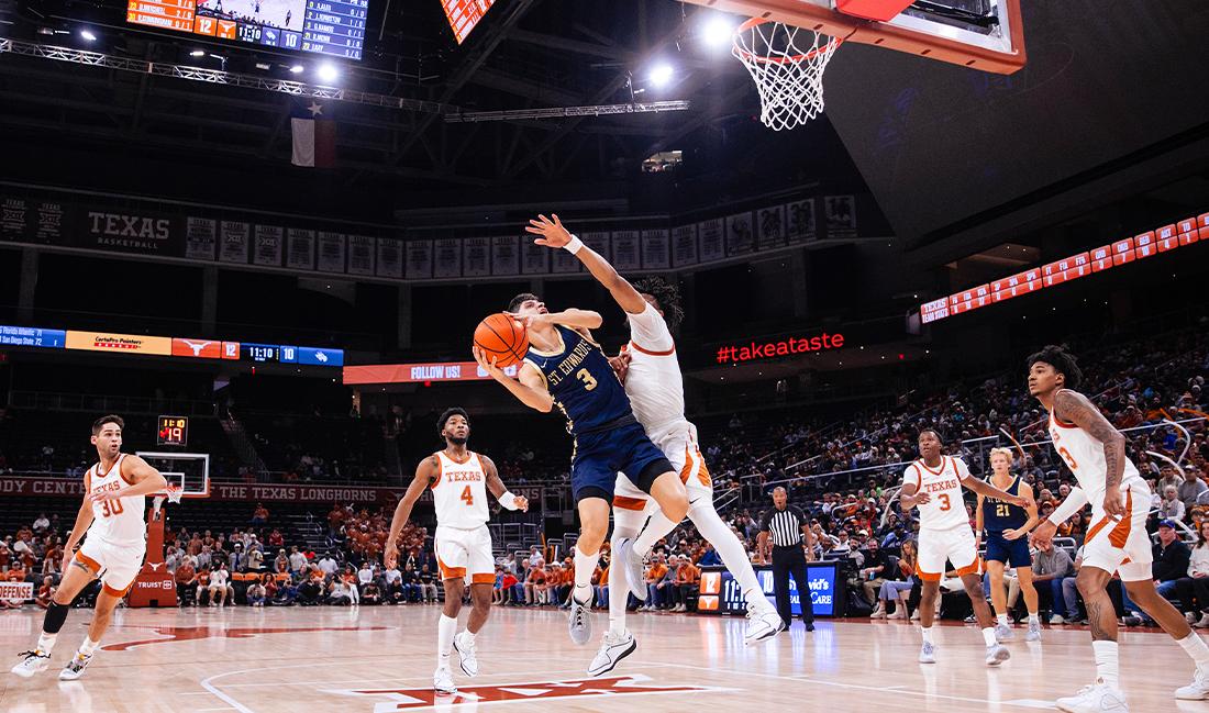 In October, the St. Edward’s Men’s Basketball team traveled to the Moody Center to face off against the University of Texas Longhorns in a historic exhibition game. Hundreds of Hilltoppers filled the arena to show support for our team as they played a competitive game against UT. Despite a 84-63 loss against the Division 1 Longhorns, St. Edward’s was a powerhouse of incomparable school spirit to the end!