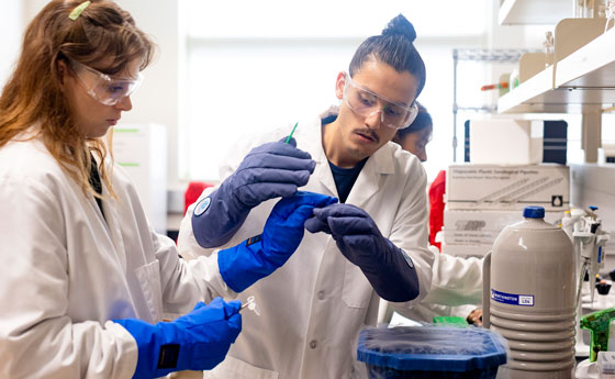 A student in scrubs administers simulated care to a manikin in the new lab space at St. Edward's