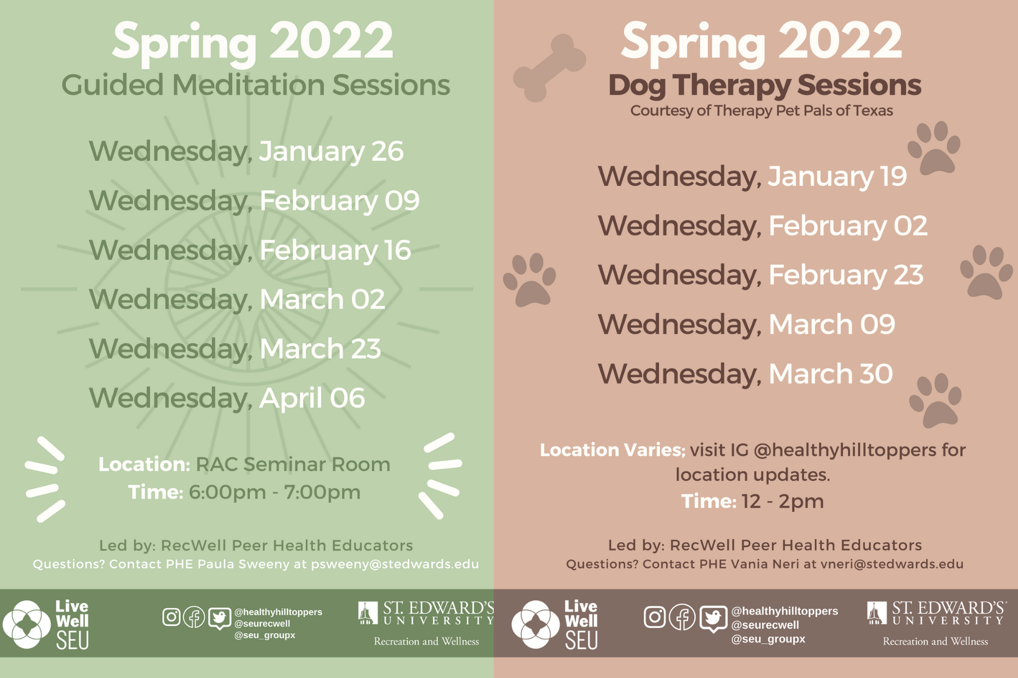 Our Peer Health Educators — trained students dedicated to empowering the St. Edward's University (SEU) community to LiveWellSEU — host engaging workshops in collaboration with campus partners. These workshops offer practical information and experiences, educating our community on healthy lifestyles and overall well-being to support a healthier campus.