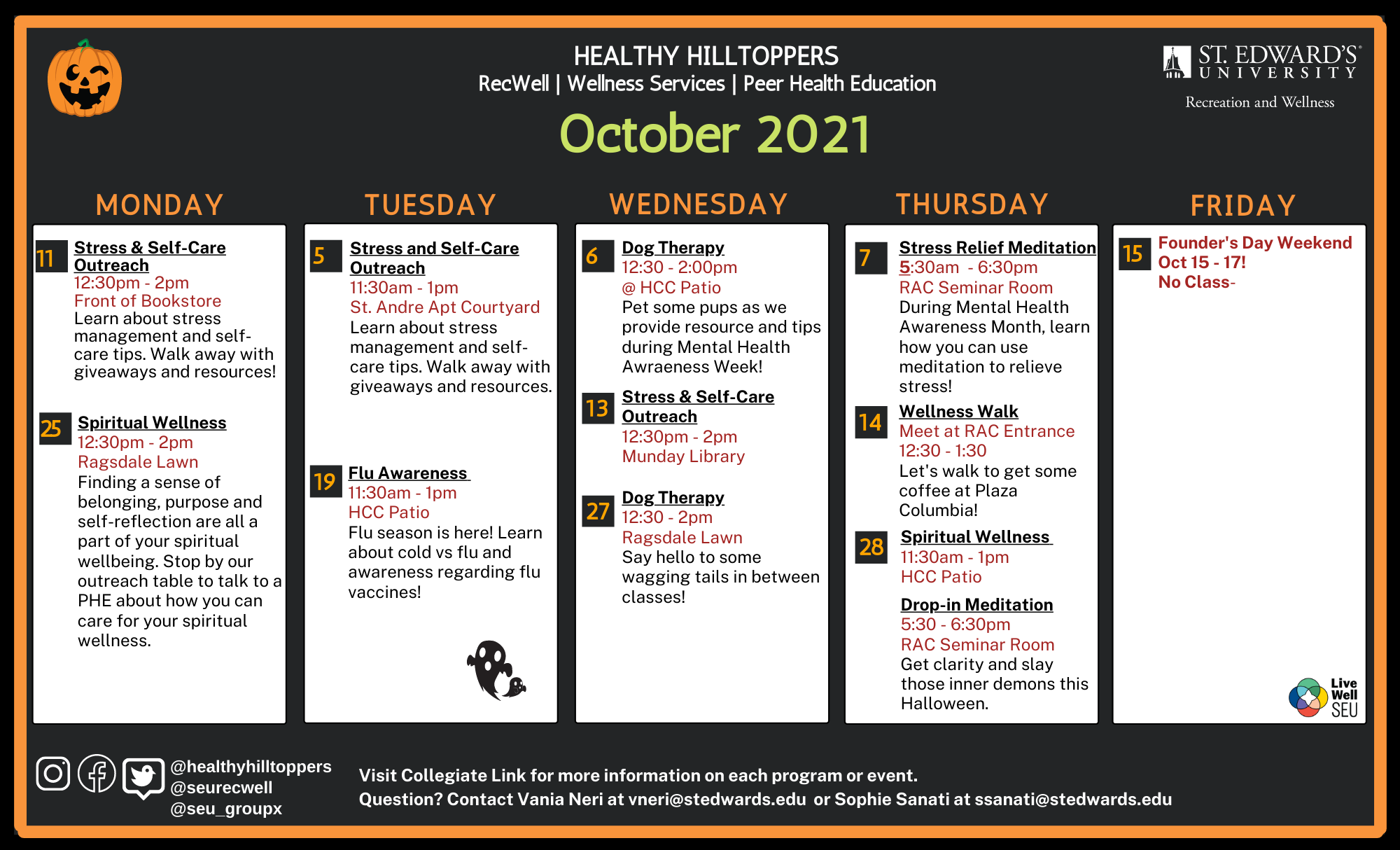 Visit our Peer Health Education outreach events to receive peer-to-peer education on various health topics, engage in interactive games and activities, and walk away with awesome prizes and resources! Students who visit are provided an inclusive, informative, safe and fun environment in which they become empowered to cultivate healthy lifestyles and promote healthy behaviors among the rest of St. Edward's student population.