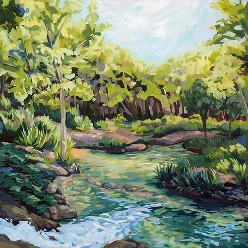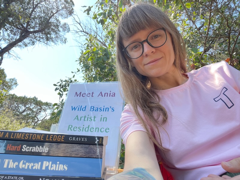 Danika Ostrowski. Ostrowski is based in Austin and is a dedicated advocate for the preservation of public lands. She paints both en-plein-air and creates in-studio work based on photographs, sketches and memories. Ostrowski began painting on the porch at Wild Basin every Friday morning until Wild Basin closed due to COVID-19 in March 2020. She restarted her residency and served as Wild Basin's Fall 2021 Artist in Residence.